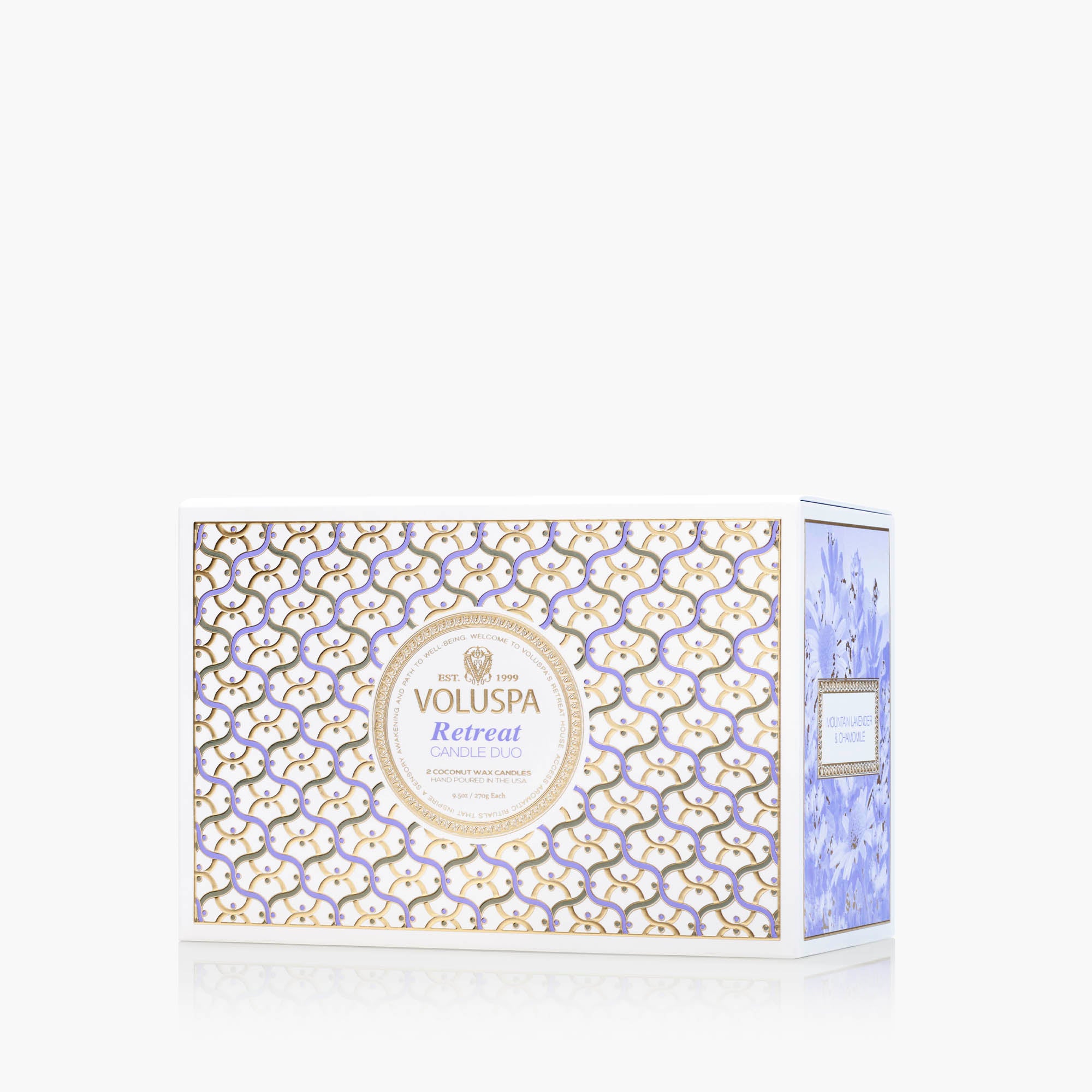 Set includes Mountain Lavender & Chamomile and Eucalyptus White Sage Classic Candle packaged in a white box with decorative lavender and eucalyptus accents.